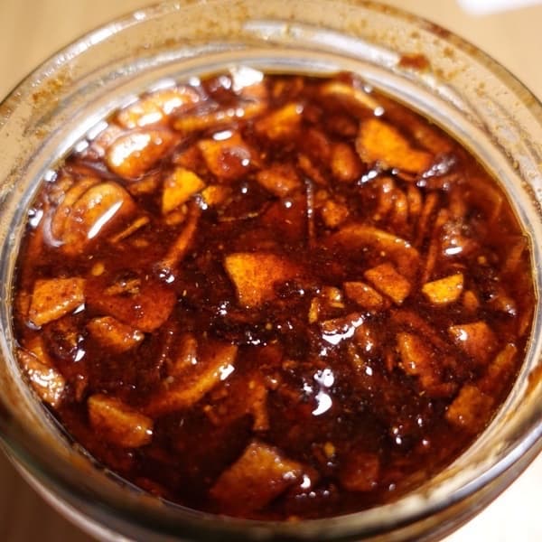 - Japanese Chili Oilcanola oil ‧ sesame oil ‧ chili powder ‧ smoke paprika powder ‧ white sesame seeds ‧ miso paste ‧ soy sauce ‧ sugar ‧ salt ‧ fried garlic slice ‧ fried shallot slice